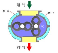 泵腔內一對8字形轉子的不斷反向旋轉,被抽氣體從進氣口吸入到轉子與泵殼之間的空間v0內,再經(jīng)排氣口排出。由于吸氣后v0空間是全封閉狀態(tài),所以,在泵腔內氣體沒有壓縮和膨脹。但當轉子頂部轉過排氣口邊緣,v0空間與排氣側相通時,由于排氣側氣體壓強較高,則有一部分氣體返沖到空間v0中去,使氣體壓強突然增高。當轉子繼續(xù)轉動時,氣體排出泵外。